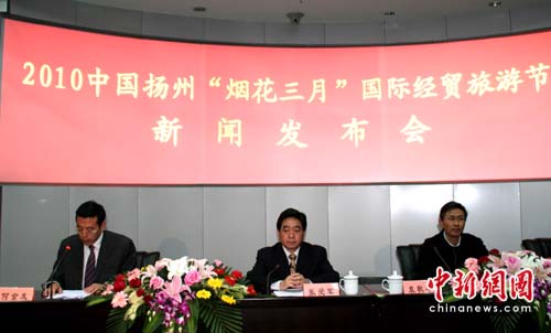揚州15日舉行新聞發(fā)布會宣布,2010中國揚州煙花三月國際經(jīng)貿(mào)旅游節(jié)將于本月18日至5月18日在揚州舉行,發(fā)布會由揚州市政府秘書長何金發(fā)主持。揚州市委常委、宣傳部長袁秋年出席參加,市委常委、常務(wù)副市長張愛軍通報了今年“煙花三月”節(jié)的有關(guān)情況。