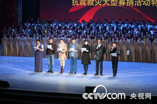 央視知名主持人周濤、朱軍、董卿、張澤群將作主持、采訪人;白巖松、李瑞英作新聞連線人;李詠、畢福劍、馬東、朱迅、任魯豫、崔永元、王小丫、撒貝寧、鞠萍、韓喬生、董浩、歐陽夏丹、李梓萌、胡蝶、魯健等50人擔(dān)任現(xiàn)場捐助熱線電話接線員。