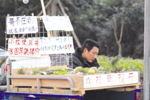 賣花哥說,“你嫂子也在江寧活動(dòng),她車上的標(biāo)語也都是我寫的,惟獨(dú)加了一句‘哥不在此處,此處卻有哥的身影’!弊詮膾焐蠘(biāo)牌之后,每天銷量增加了一半。去年一年夫妻兩人的營業(yè)額是八萬元,今年花哥準(zhǔn)備沖十萬。