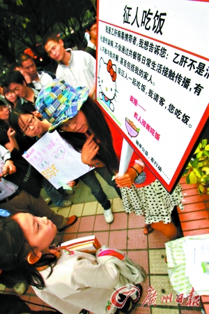 “我是乙肝病毒攜帶者,我想告訴您:乙肝不是消化道傳染病,不會(huì)通過(guò)共餐等日常生活接觸傳播,有人不敢與我共餐,甚至包括我的家人,F(xiàn)征人一起吃飯,我請(qǐng)客,您吃飯。”昨日,廣州購(gòu)書中心門前,一名女孩高舉著這樣一塊牌子要征人一起吃飯。女孩的網(wǎng)名叫鋤草,是一名留日海歸,跟網(wǎng)友成立了“鋤草”科普組織,專門進(jìn)行乙肝科普活動(dòng)。