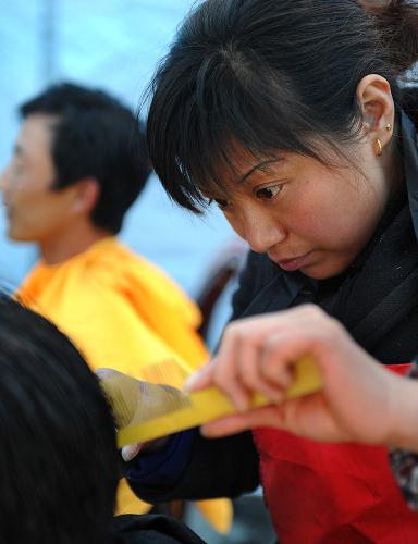 4月26日,來自四川省大邑一建公司的范春會在為結(jié)古鎮(zhèn)群眾免費(fèi)理發(fā)。在地震災(zāi)區(qū)青海玉樹結(jié)古鎮(zhèn),一些志愿者利用自己的業(yè)余特長,為群眾義務(wù)理發(fā)。新華社記者陶明攝