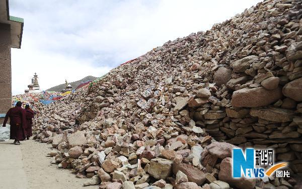 4月19日,國家級物質(zhì)文化遺產(chǎn)嘉那嘛呢石堆受損嚴(yán)重。 據(jù)青海省文物局通報,在玉樹地震受災(zāi)區(qū)域中,眾多文物受損嚴(yán)重,大量建筑倒塌,珍貴文物被埋。 新華社記者 江宏景 攝