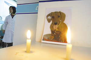 昨日下午,南京市畜牧獸醫(yī)站寵物醫(yī)院內(nèi),進門的方桌上,一張寵物狗生前的照片,幾許燭光讓人勾起對愛犬的思念,幾名身穿白衣的工作人員也為小狗的不幸感到惋惜。狗主人韓女士告訴記者,照片上這條臘腸犬名叫“帥帥”,是一條3歲多的公狗,這三年多來與她朝夕相處,感情很深。從5月2日開始,她發(fā)現(xiàn)平時活潑好動的帥帥變得沉悶,不喜動,食欲很差,還伴隨著嘔吐,明顯是生了病。愛犬變成這樣,韓女士心疼不已,帶著它來到位于四平路附近的一家寵物醫(yī)院治療。