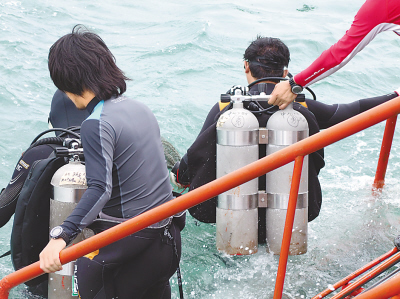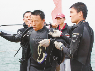 即將下水的王志杰笑吟吟地說:“今天會有8個人下水,每組兩人。潛水很危險,每深10米,就會增加一個大氣壓,所以必須兩人一組互為潛伴,還得相對固定。因為在水下,大家只能靠手勢溝通?脊鸥没ハ嗯浜希瑳]有一個同伴會將另一個孤單地扔在那個黑漆漆的世界。”