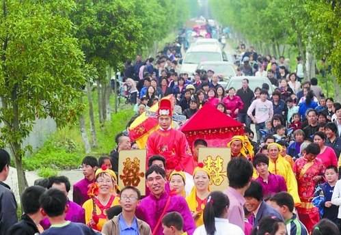 前天上午,浙江嘉興平湖新倉鎮(zhèn)友聯(lián)村,冒出了一支身穿古裝的隊伍。前面有舞獅隊、鑼鼓隊,后面還有大花轎和一名騎著馬的新郎倌。
