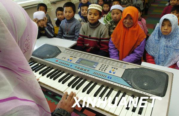 資料圖片:2007年11月19日,穆斯林孤兒院的老師正在給孩子們上音樂(lè)課。寧夏回族自治區(qū)首家穆斯林孤兒院在銀川開園。該孤兒院由寧夏穆斯林福利協(xié)會(huì)與科威特亞洲穆斯林委員會(huì)合作修建,建筑面積2100平方米,可容納300名孩子。新華社記者 王鵬 攝