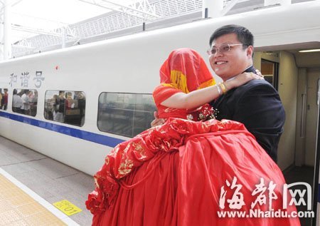 提著紅棗桂圓湯,掀起新娘的紅蓋頭,為一節(jié)車廂的乘客分發(fā)喜糖,昨天上午9時41分,新郎官郭曉峰坐上動車,準(zhǔn)備將自己的媳婦黃菲菲迎娶回福州的家,動車乘客們見證了他們特別的娶親儀式。