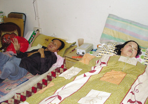 今年59歲的黃瑞根,家住鎮(zhèn)江新區(qū)銀山鑫城小區(qū),曾是名醫(yī)生。昨天上午,記者來到黃瑞根與妻子所住的車庫里,推開門就看到窄小的空間里擺放著兩張床。黃瑞根正因晚期骨癌引起的劇痛,在痛苦地呻吟;妻子則睡在他的旁邊,鼻孔里插著一根導管,雖然是個“睡”了3年多的植物人,但面色紅潤。