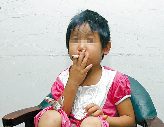 小雅文抽煙的動作利索得令人吃驚,她用右手食指和拇指夾著香煙,悠然自得地點燃,叼在嘴邊,深吸一口,白煙從嘴里和鼻孔慢慢連貫地吐出,中指還不時地彈掉煙灰,抽煙動作儼然是一名老煙民。短短5分鐘,就連續(xù)抽了兩根煙。她只是一個不到4歲的女孩,煙齡已經(jīng)將近一年。