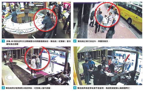 陳佑銘女兒陳怡透露,事發(fā)當(dāng)日(22日)其父被鄭姓導(dǎo)游要求在紅磡JW Jewellery Outlet Limited珠寶店逗留至少2小時。由于珠寶店大門關(guān)上、樓底矮、人多又沒座位,他感到局促,在店內(nèi)逗留半小時后到店外透氣,20分鐘后鄭導(dǎo)游要求他回到店內(nèi)。陳怡說:“當(dāng)時父親表明自己身體不適,又有心臟病,導(dǎo)游反而搶白父親是以病威脅,令老人家非常氣憤!标愑鱼懹诳诮瞧陂g病發(fā)暈倒,送院后證實死亡。