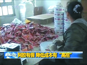 據(jù)央視《每周質(zhì)量報告》報道 阿膠是一種滋補品,主要由整張驢皮熬制而成,因原產(chǎn)山東東阿縣而得名。在山東東阿縣有很多阿膠制品企業(yè),記者調(diào)查時發(fā)現(xiàn),當(dāng)?shù)氐陌⒛z制品生產(chǎn)企業(yè),所用的原料很多是摻有牛皮、馬皮的劣質(zhì)阿膠。河北無極縣永豐藥業(yè)一國藥準(zhǔn)字號阿膠是使用劣質(zhì)皮料熬制而成。