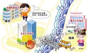 同住一個城市,感情也沒問題,小夫妻卻長達(dá)一月不見面——自從將房子買到離工作單位較遠(yuǎn)的渝北后,劉方斌和妻子無奈當(dāng)起周末夫妻。