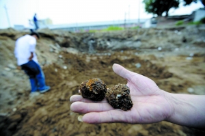 圖為記者在工地現(xiàn)場發(fā)現(xiàn)的兩枚鐵疙瘩。晨報(bào)記者 郝笑天/攝