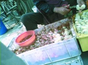在其中一個(gè)加工攤點(diǎn),一名女子拿著剪刀,正在完成第一道工序,將雛雞的雙腿和頭剪掉。