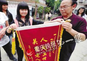 學(xué)校校長將老人家屬送來的錦旗轉(zhuǎn)交給小黃。冉文攝(圖片來源:重慶晚報(bào))