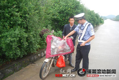 高速交警駕車巡邏至離良田收費(fèi)站2公里處(1809公里),發(fā)現(xiàn)一男子身披雨衣,正晃晃悠悠地騎著一輛摩托車沿路肩朝廣州方向駛?cè)ァ?/P>