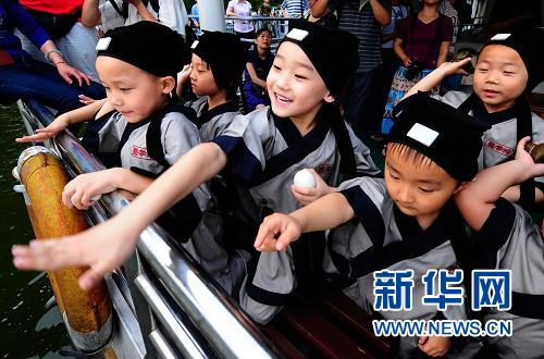 6月15日,小朋友們身著學(xué)童服,在武漢東湖向湖中投粽,祭祀屈原。當(dāng)日,武漢在東湖屈原行吟閣舉行端午屈原祭祀活動。本次祭祀活動由武漢大學(xué)國學(xué)班的學(xué)子等依照古禮,按照傳統(tǒng)祭祀儀式進(jìn)行。新華社記者 程敏 攝