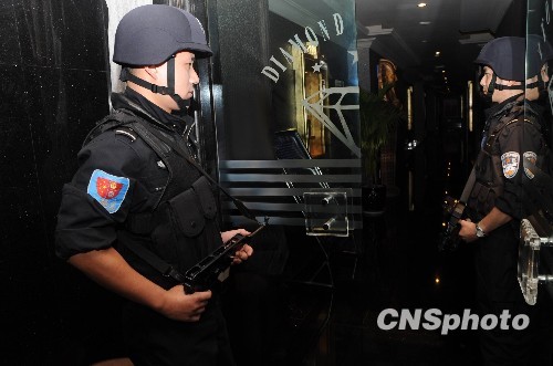 重慶希爾頓酒店因股東涉黑,介紹、容留婦女賣淫,違法經(jīng)營和故意擾亂社會(huì)秩序,于6月20日被當(dāng)?shù)鼐截?zé)令停業(yè)整頓。圖為警方清查該酒店內(nèi)一夜總會(huì)。 中新社發(fā) 渝公安 攝