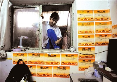 王夏穎從她的小隔間翻窗出來準(zhǔn)備去考場,墻上貼滿了獎狀。