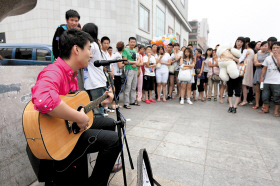 “你是我的眼/帶我領(lǐng)略四季的變換/你是我的眼/帶我穿越擁擠的人潮……”昨日18時(shí),在人流擁擠的長(zhǎng)春市紅旗街上,一對(duì)情侶站在街邊看著路邊歌手在演唱。突然,男子走了上去,接過(guò)歌手手中的吉他,自己開(kāi)始彈唱起來(lái)。