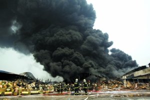 昨晨,位于房山區(qū)石樓鎮(zhèn)下坡子村的北京燕房華興倉儲(chǔ)有限公司庫房起火,大量化學(xué)品燃燒產(chǎn)生黑色濃煙。50余輛消防車約500名消防官兵參與救援,至下午2時(shí)許,大火基本被撲滅,事故未造成人員傷亡。安監(jiān)局人員表示,倉庫中堆放的丙酮及苯酚均含毒,屬危險(xiǎn)化學(xué)品。記者 吳江 攝