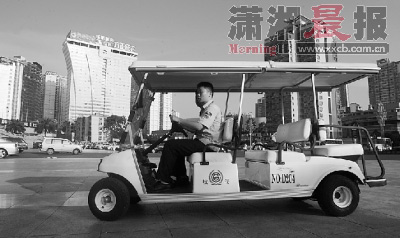賀龍?bào)w育館附近,大學(xué)生協(xié)管員沈溪濱和同事開著巡邏車在轄區(qū)內(nèi)巡邏。記者秦樓