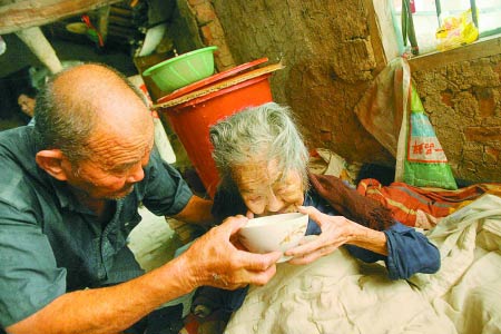 張東明是駐馬店市平輿縣萬金店鎮(zhèn)大王莊村民。53年前,17歲的張東明娶了蔡婆婆的獨生女兒為妻,便把岳母接到了家里。1986年,張東明的妻子去世,46歲的張東明帶著兒女承擔起了照顧岳母生活的重擔。時間一晃又過去了24年,如今,蔡婆婆已是百歲老人,張東明也進入了古稀之年。