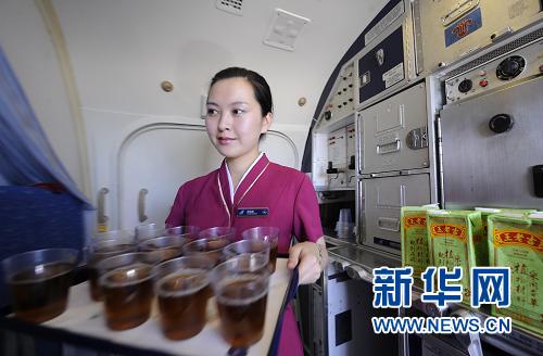 7月6日中午,南方航空公司一位乘務(wù)員準(zhǔn)備向機(jī)上旅客發(fā)放涼茶。為應(yīng)對(duì)持續(xù)的高溫天氣,南航近期開始增加機(jī)上消暑飲品的供應(yīng)量,其中涼茶占到機(jī)上飲品的4成以上,比平時(shí)增加了一倍。新華社發(fā)(徐勤濤 攝)