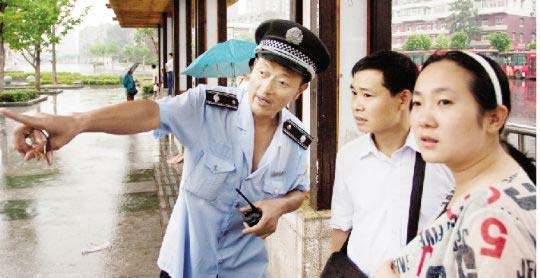 昨日,武昌火車站東廣場,協(xié)管員唐輝為路人指路。記者 原麗陽 實習生 王國欣 攝