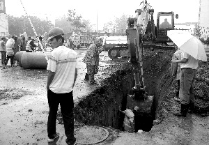 此處地鐵施工單位中鐵一局工作人員稱,前日下午天降暴雨,導致該路口積水,隨后工人發(fā)現(xiàn)地鐵站底層有大量積水。他們通知相關部門,并決定于昨日早上進行整修。“還沒修,路就塌陷了!痹摴ぷ魅藛T稱,昨日早上4點40分,地面塌陷。隨后,塌陷處燃氣管道斷裂。燃氣公司將閥門關閉。