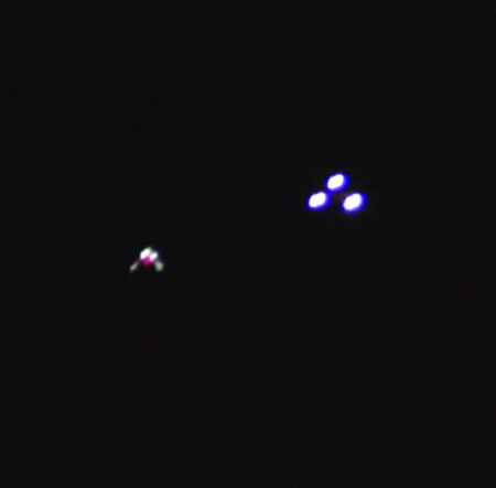不明飛行物其中一個三點發(fā)白光,非常亮,另一個發(fā)紅光。 網(wǎng)友“馬背上的小男孩” 圖