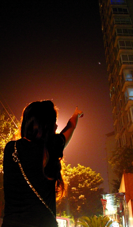 “快點來看,沙坪公園上空出現(xiàn)了4個不明飛行物。”昨晚9時15分,記者接到市民報料后立即趕到沙坪公園。記者在公園后門的雅豪麗景小區(qū)看到,天空有3個白色亮光,正呈品字形往上空緩慢地移動。