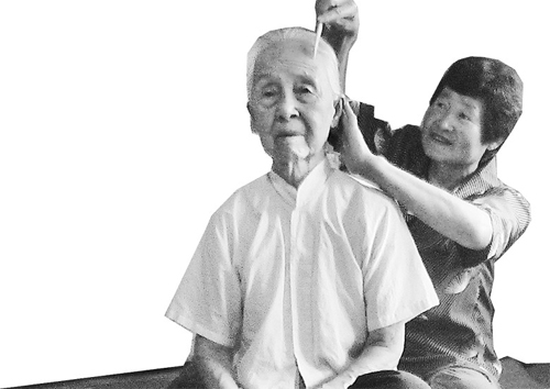王振燕為孔祥琴老人梳頭。 周萬良 岳培新攝
