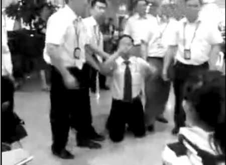 “大叔”再次勸說旅客登機(jī)未果,隨后單膝下跪,抱拳高舉頭頂。女乘客依然大叫沒用。大叔隨后雙膝下跪,兩手撐地,額頭點(diǎn)地。旁邊的工作人員想扶起大叔,大叔皆拒絕。
