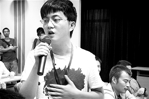 在加拿大留學(xué)的四川籍年輕人冉洪瑞利用假期回國,與老鄉(xiāng)組團(tuán)來參加培訓(xùn),這是他在會上發(fā)表自己的觀點(diǎn)。