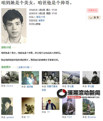 日前,有豆瓣網(wǎng)友號召網(wǎng)友貼出爸媽年輕時候的照片,再現(xiàn)他們的青春風(fēng)采;顒幽壳耙盐6000多網(wǎng)友參與,還有人提議評出最帥的爸爸和最美的媽媽。