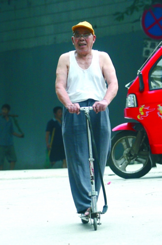 穿著一件白色背心和深色短褲,一頂黃色鴨舌帽掩不住花白的頭發(fā),當(dāng)87歲的李海和大爺腳踩滑板,以這種“拉風(fēng)”的形象出現(xiàn)在人們面前時(shí),回頭率極高。李大爺自稱踩滑板有七年了,不論是外出游玩,或買菜購物,他都踩著它。