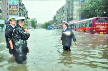 洛陽市很多交警堅守在深深的積水中 大河網友供圖