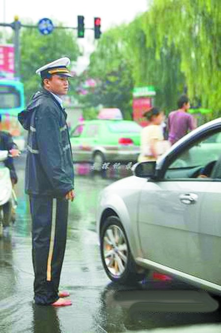 在傾盆大雨中,一個年輕的身影感動了正在陪同客人游覽的網友“探路者0379”,于是,他用手中的相機記錄下了這感人的場面:一個赤足踩在渾濁的積水中指揮交通的協警。