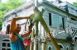 羅大爺在自己的夢想莊園(左側(cè)在建部分)前,示范一個(gè)人吊裝預(yù)制板。