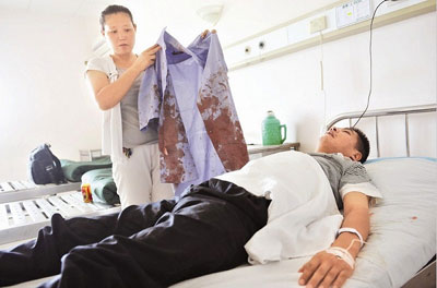 “我現(xiàn)在非常難受,頭很暈,鼻子感覺(jué)很不透氣!弊繋煾嫡f(shuō)完,守護(hù)在一旁的妻子拿出他當(dāng)時(shí)穿的藍(lán)色制服,整件衣服上都是血跡。據(jù)主治醫(yī)生透露,卓師傅身上多處皮膚表面創(chuàng)傷及軟組織挫傷,需要住院進(jìn)一步檢查和觀察才能確定傷勢(shì)。