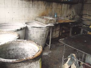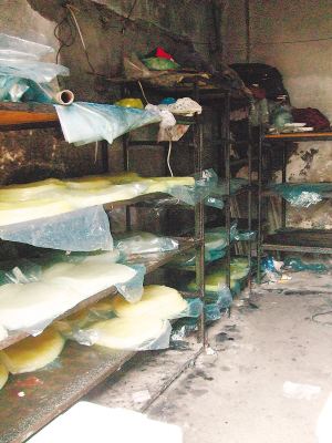 院子里有兩間平房,記者走進(jìn)其中一間,一陣夾雜著難聞氣味的蒸汽撲面而來,地面上到處流淌著污水。蒸涼皮的灶臺旁有幾只大水桶,都沾滿了白色的面粉。記者打開其中一個大塑料桶的蓋子,只見里面的水烏黑發(fā)綠,上面還漂著一層泡沫,舀出一勺細(xì)聞,有股異味。另一間屋子里存放著加工好的成品,一個個白色塑料盒里裝著用塑料袋包裝好的“東北大拉皮”。一個黑乎乎的鐵制貨架上竟直接堆放著大量已經(jīng)做好的涼皮,沒有任何遮蓋,任憑酷熱和蚊蠅的侵蝕。地面上堆放了許多雜物,有加工用具、原料等。