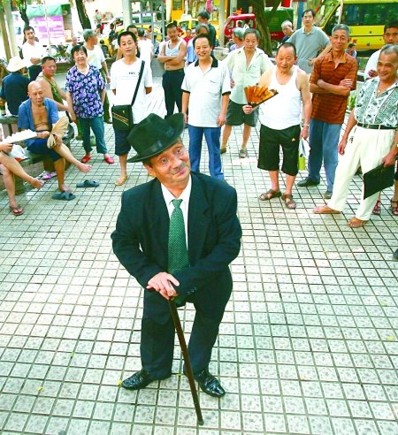 他拄著拐杖,腳成外八字,睜圓了眼睛,不斷地動(dòng)著嘴唇,時(shí)而將拐杖扛在肩上,嘟著嘴巴,做著一連串的搞怪動(dòng)作,逗得市民捧腹大笑。因動(dòng)作較大,他一踢腿,腳上的大皮鞋甩飛了,市民們更是笑彎了腰。
