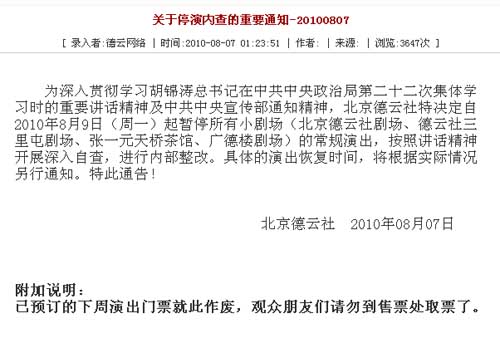 這個7日凌晨1點(diǎn)多發(fā)布的通知里提到,為深入貫徹學(xué)習(xí)有關(guān)精神,北京德云社特決定自2010年8月9日(周一)起暫停所有小劇場(北京德云社劇場、德云社三里屯劇場、張一元天橋茶館、廣德樓劇場)的常規(guī)演出,按照講話精神開展深入自查,進(jìn)行內(nèi)部整改。具體的演出恢復(fù)時間,將根據(jù)實際情況另行通知。已預(yù)訂的下周演出門票,就此作廢。