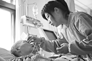 前日,關(guān)欣在病房陪伴父親。近日,她收到美國大學(xué)的錄取通知,為了照料父親,她決定放棄留學(xué)。記者 王嘉寧 攝