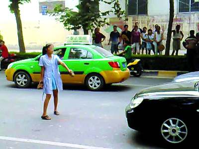上午10時40分,女孩跑到一旁拿了路邊的磚塊,不停地往路中央扔,很多車見狀不敢前行。后來她干脆拎著兩塊磚,堵住高檔私家車。“被她鬧得都堵車了,堵了100米,有五六分鐘。”目擊者姚先生說。一個婚禮車隊被堵住,一女士下車和她理論,兩人扭打在一起。姚先生說,女孩后來被兩個男的推倒,可能是摔疼了,跪在地上不停地哭。11時,民警趕到后將其帶走。