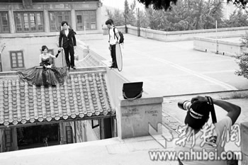 為了融入古建筑的碧瓦灰墻,不惜飛檐走壁,冒險(xiǎn)踩在屋頂?shù)臋M梁上拍攝婚紗照。昨日下午,記者在寂靜的武大櫻園頂上看到,一對新人為拍出好照片,站的位置讓人側(cè)目。(記者劉蔚丹攝影報(bào)道)
