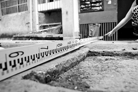 沒幾天,24幢2單元5樓的張大伯也感到不對勁!翱傆X得樓房在晃,后來發(fā)現(xiàn)只要小區(qū)附近有大車開過,房子都會晃。剛開始,我還以為是自己身體有什么問題,問了家人和對門鄰居,才發(fā)現(xiàn)大家都感覺到了!弊蛱煜挛纾^發(fā)花白的張大伯這樣和記者描述第一次感覺到沉降的感覺。他說:“這種生活別人真是無法想象,我年紀大了,真不知道什么時候才能解決問題!