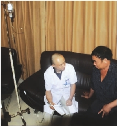 8月19日,湘雅三醫(yī)院,戴英波正在吊吊瓶,一名患者過(guò)來(lái)向他咨詢病情。記者 龔磊 攝