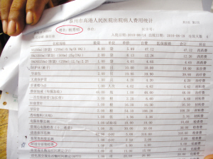昨天下午,楊茂海在高港大泗鎮(zhèn)的家中,向記者出示了由高港人民醫(yī)院出具的賬單。指著其中一項(xiàng)“陰道分泌物檢查,1次,5元”,楊茂海情緒激動(dòng)地稱,我爸爸是男的,“陰道分泌物檢查”從何而來。